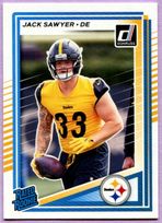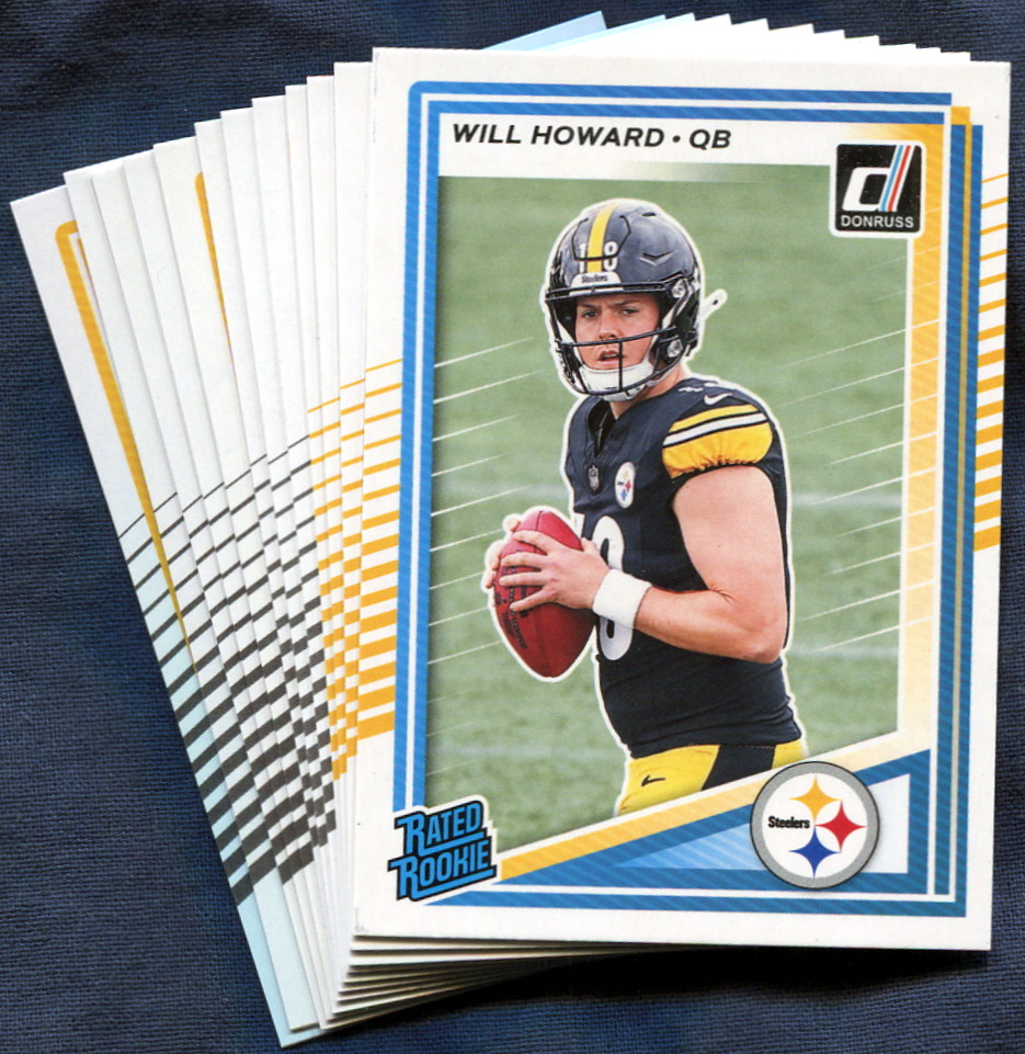 The 2025 Donruss Pittsburgh Steelers NFL football cards Team Set contains 12 Pittsburgh Steelers NFL football cards including Star Players like T.J. Watt, Mike Williams and the rookie cards of Will Howard, Kaleb Johnson, Jack Sawyer and Derrick Harmon. All cards in this team set listed below.