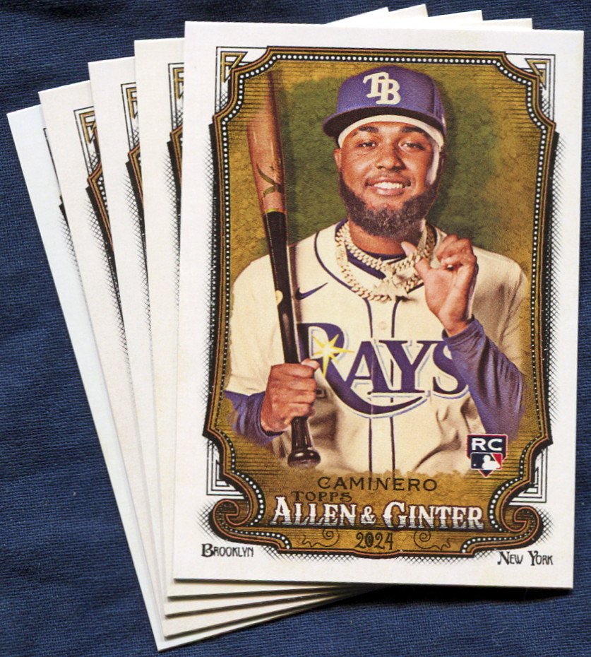 The 2024 Topps Allen and Ginter Tampa Bay Rays Team Set contains 5 Tampa Bay Rays baseball cards including Star Players Randy Arozarena, Yandy Diaz and the rookie cards of Junior Caminero and Curtis Mead. All cards in this team set are listed below.