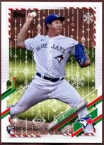 The 2021 Topps Holiday Toronto Blue Jays baseball card Team Set contains 11 Toronto Blue Jays baseball cards including Star Players like Vladimir Guerrero Jr, Bo Bichette, George Springer, Jose Berrios and the rookie card of Nate Pearson. All cards in the set are listed below.