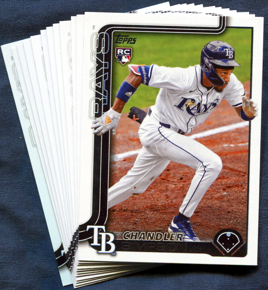 The 2025 Topps Update Tampa Bay Rays Baseball Card Team Set contains 12 Tampa Bay Rays baseball cards including rookie cards like Chandler Simpson, Jake Mangum, Hunter Bigge, Eric Orze and Jamie Westbrook. All cards in this team set are listed below.